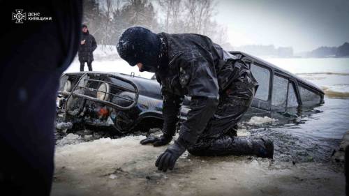 “За допомогою троса та лебідки автомобіль просунули під кригою майже від середини водойми, прорізали отвір і витягли на берег”, – сказано в повідомленні.
