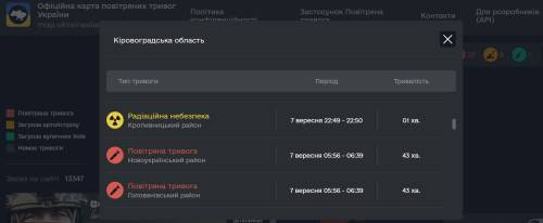 Радіаційна тривога для району Кропивницького з'явилася на карті повітряної тривоги приблизно о 22:49 і залишалася активною близько однієї хвилини.