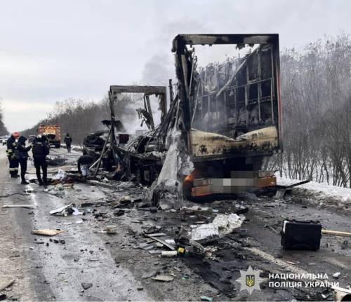 В результаті зіткнення керманич автобуса та водій автопоїзда померли на місці аварії.