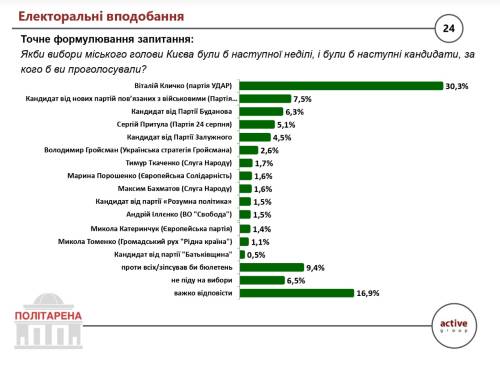 “Кличка готові підтримати 30,3% виборців – це найбільший відсоток серед усіх запропонованих кандидатів”, – відзначили в Active Group.