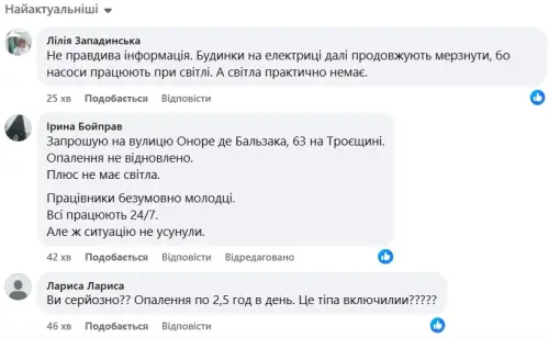 Інші дописувачі вказують конкретні адреси, де “опалення не відновлено, а ще й немає світла”.