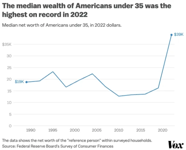 Так само, медіанний рівень багатства американців віком до 35 років у 2022 році був найвищим за всю історію спостережень.
