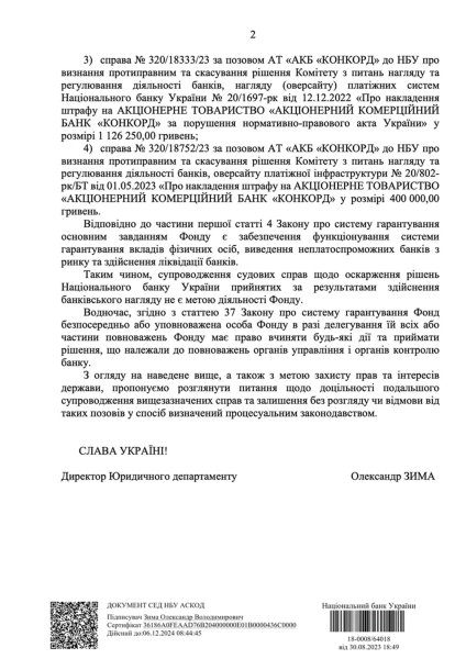Кримінальне провадження № 62023100110000229 проти головного юриста НБУ Державне бюро розслідувань відкрило наприкінці 2023 року через ймовірне зловживання владою або службовим становищем, що спричинило тяжкі наслідки. Зима, котрий одночасно є головою адміністративної ради Фонду гарантування вкладів фізичних осіб, втрутився в судові процеси шляхом направлення листа від імені Національного банку України до Фонду. У листі він “рекомендував” відкликати позови, подані проти Нацбанку. Слід зазначити, що головний юрист регулятора просив відкликати позови банку “Конкорд”, подані ще до старту процесу його ліквідації. Позивач у суді планував оскаржити штрафи на суму майже 63,5 мільйона гривень, накладені регулятором.