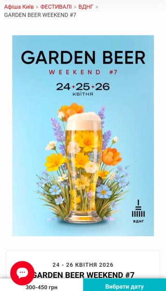 24–26 квітня – Garden Beer Weekend #7 – Київ У культурному осередку ВДНГ (Київ) Garden Beer Weekend #7 відкриє свої двері 24–26 квітня 2026 року для шанувальників крафтового пива, вуличної їжі та музики на відкритому повітрі. Подія навіть була включена в афіші квиткових сервісів як один з найважливіших фестивальних заходів весни.