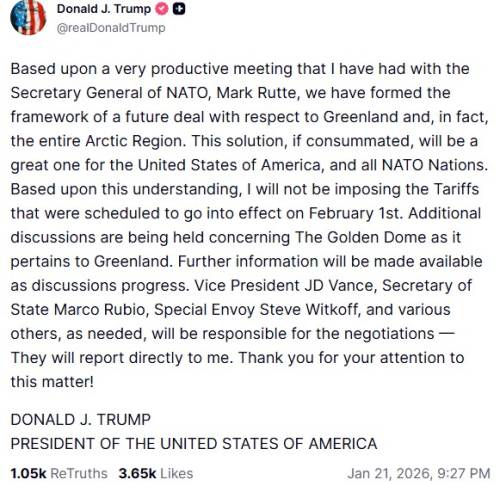 Він відзначив, що враховуючи досягнуту домовленість, “не впроваджуватиме тарифів” проти восьми держав НАТО, котрі мали набрати чинності 1 лютого.