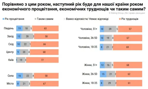 Як зауважує “Рейтинг”, значна частина українців (64%) гадає, що прийдешній рік принесе економічні труднощі (у 2023 році таких було 52%, у 2024 році – 63%).