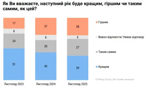 Думку про те, що наступний рік буде ліпшим за минулий, поділяє 39% опитаних (у 2023 році так відповіло 51% респондентів, у 2024 році – близько 40%).