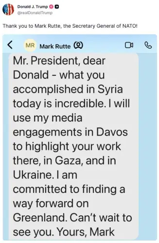 “Я сповнений наміру знайти рішення щодо питання Гренландії”, – також написав Рютте. “З нетерпінням чекаю зустрічі з вами”, – додав він.