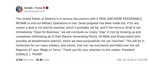 30 березня Трамп заявив, що Іран погоджується з більшістю пунктів його мирного плану.