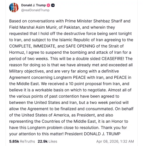 Трамп вважає пропозицію Ірану з 10 пунктів “практичною основою для перемовин”. Він стверджує, що “фактично всі дискусійні моменти” між двома країнами вже узгоджено, але двотижневе перемир’я дасть змогу завершити домовленість.