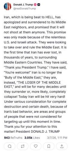 6 березня Трамп заявив, що не буде підтримувати жодної угоди, окрім “беззастережної капітуляції” Тегерана, і закликав “зробити Іран знову великим”.